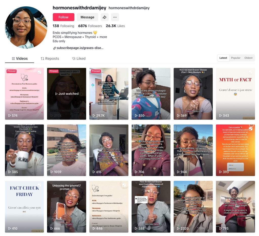 Aje makes it clear that her platform is for educational purposes only, no diagnoses, no prescribing medications, just a guide on what patients might want to ask their doctors about. A racing heart might be more than anxiety; sudden weight loss might mean something needs to be checked up. A video from a board-certified endocrinologist on Instagram or TikTok carries more weight than a Google search.